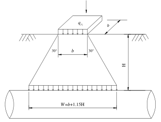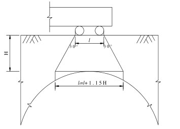 根據(jù)規(guī)范確定波紋管的參數(shù)之后,需要進(jìn)行應(yīng)力的驗(yàn)算。先要確定荷載,波紋管涵上荷載與其他類(lèi)型涵洞并無(wú)太大差別,汽車(chē)荷載考慮了30度的擴(kuò)散,如圖2.5所示。土的重力考慮土拱系數(shù),荷載+恒載的大小隨覆土高度并非線(xiàn)性變化,如圖2.6所示,在覆土高度小的時(shí)候活載比例較大,而當(dāng)覆土高度大于兩米甚至又可以忽略活載,本次設(shè)計(jì)填土高度為0.6m,活載所占比例較大,對(duì)涵洞受力影響較大。不過(guò)在通過(guò)規(guī)范所列公式計(jì)算波紋管應(yīng)力時(shí),結(jié)果表明波紋管的承載能力很大,0.6m級(jí)別的填土加活載對(duì)其應(yīng)力影響很小。